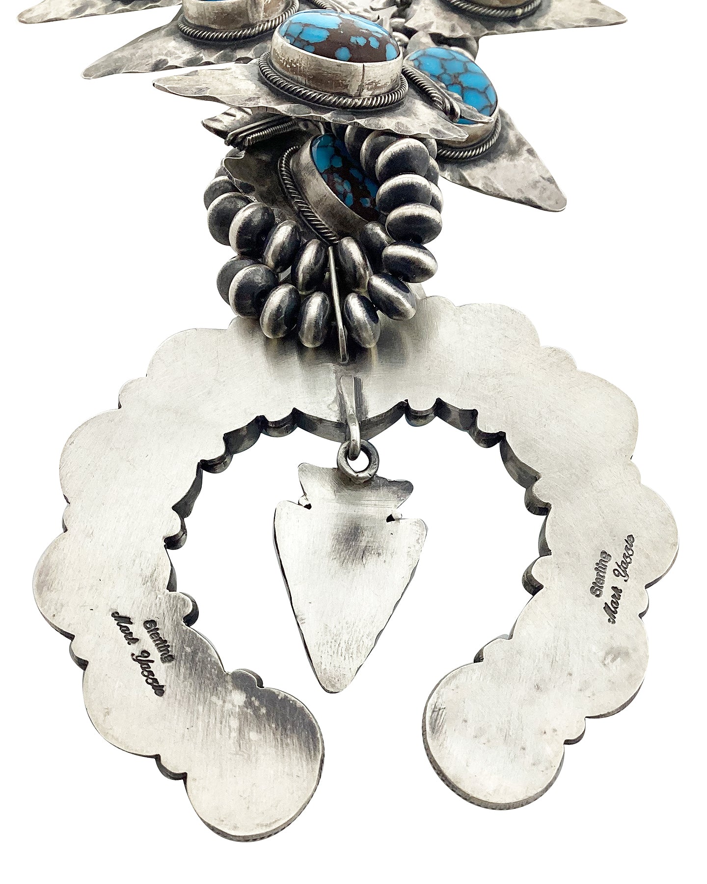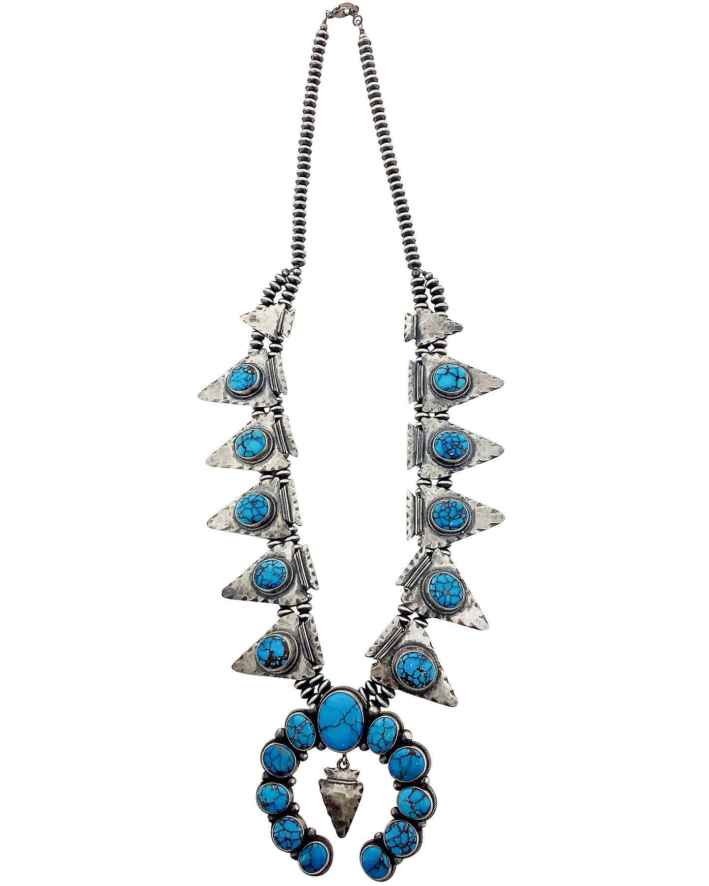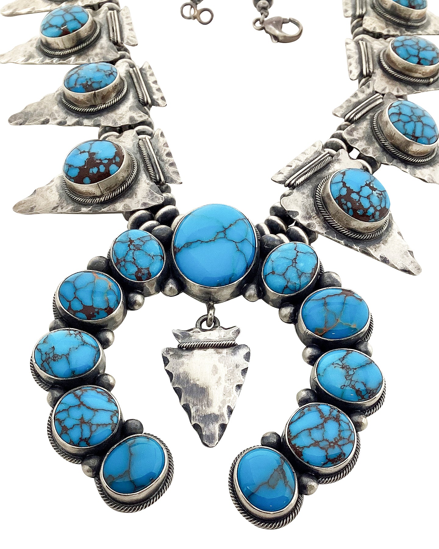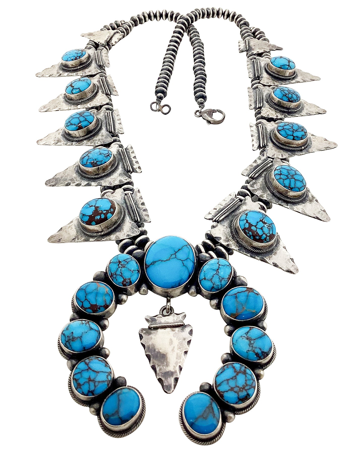 The Four Corners area draws tourist from around the world during all four seasons. This area has so many unique offerings from the outdoors, cuisine & diverse cultures that you never are without something to do. However, most come to see the incredible art of the Native Americans. We are talking carvings, rugs, pottery, fetishes and the amazing pieces you wear. Navajo artist Marc Yazzie is one of those talented artists who make those magnificent pieces. This Egyptian Turquoise necklace is absolutely stunning. He has used twenty-one pieces of the rich colored blue stone to fill the arrowhead themed necklace. Marc dresses up the turquoise with distinct silver work that will give you that rustic Four Corners look. The naja brings everything together perfectly, and hangs from sterling silver beads.