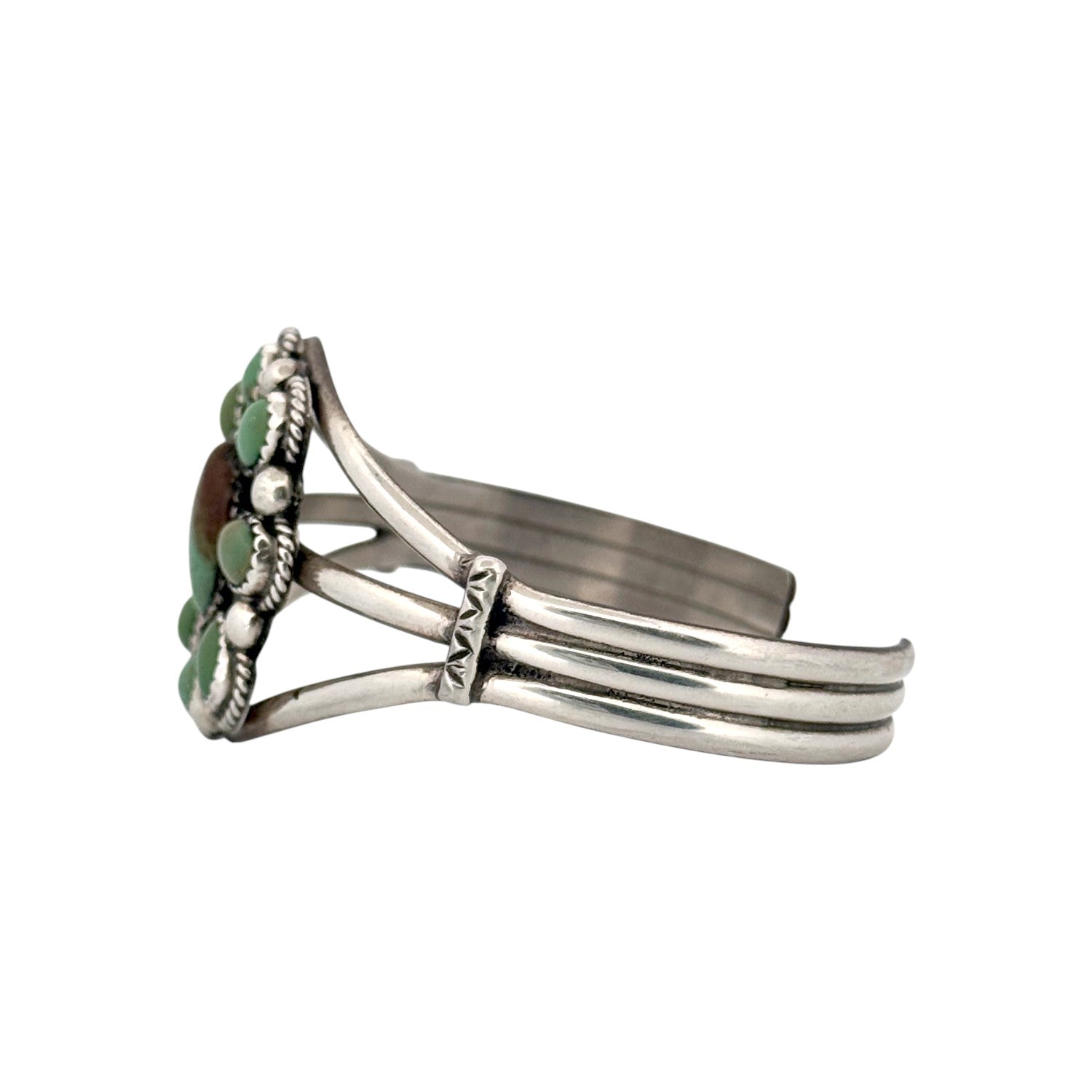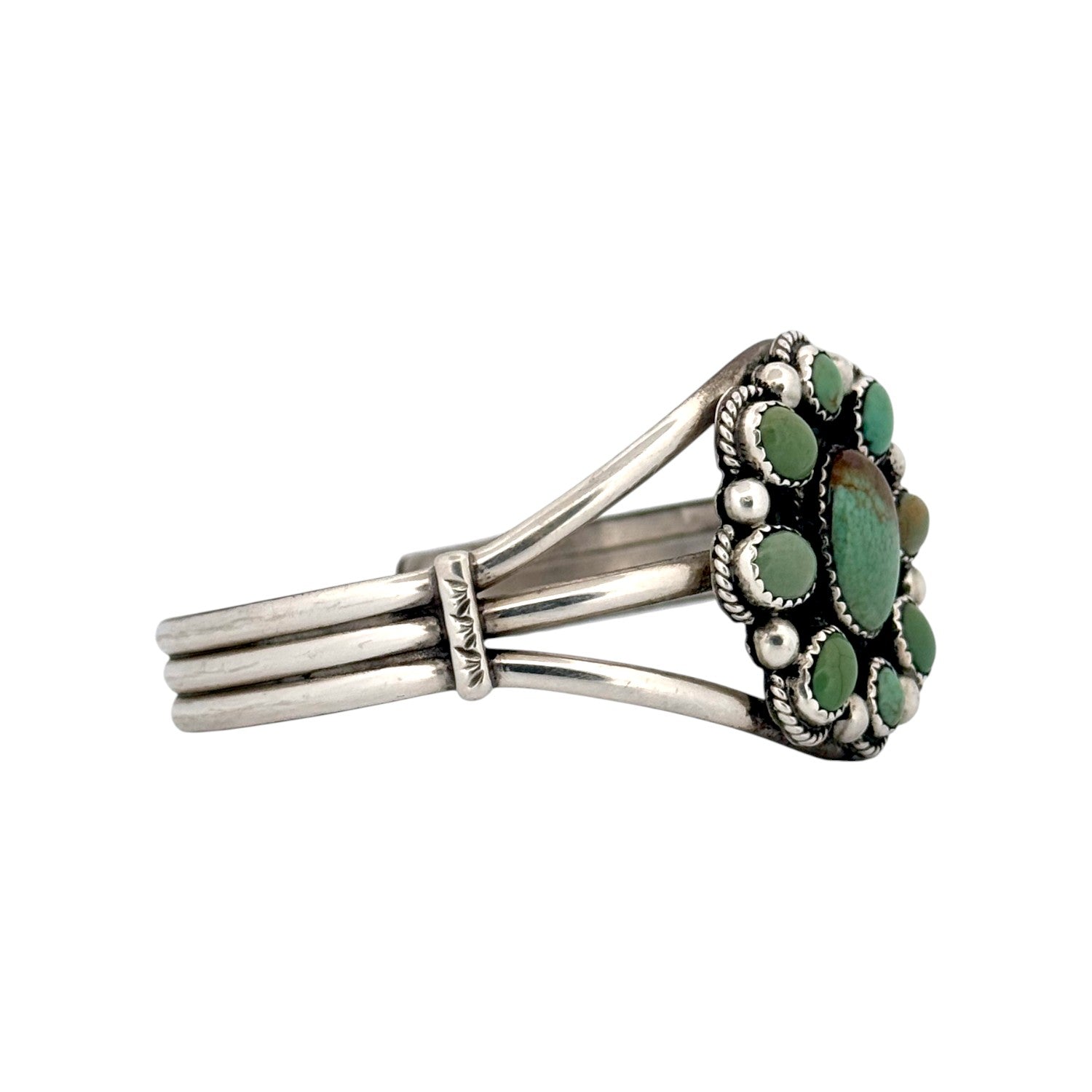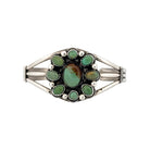 This stunning Navajo handmade bracelet by Phillip Yazzie highlights the rich tones of Green Kingman Turquoise, beautifully arranged in a classic cluster design. Each stone displays natural variations of green and brown matrix, bringing depth and character to the piece. The stones are set in hand-twisted sterling silver rope detailing, framed with polished silver beads for a traditional Navajo finish. The split-shank cuff design provides a comfortable fit while maintaining balance and strength.